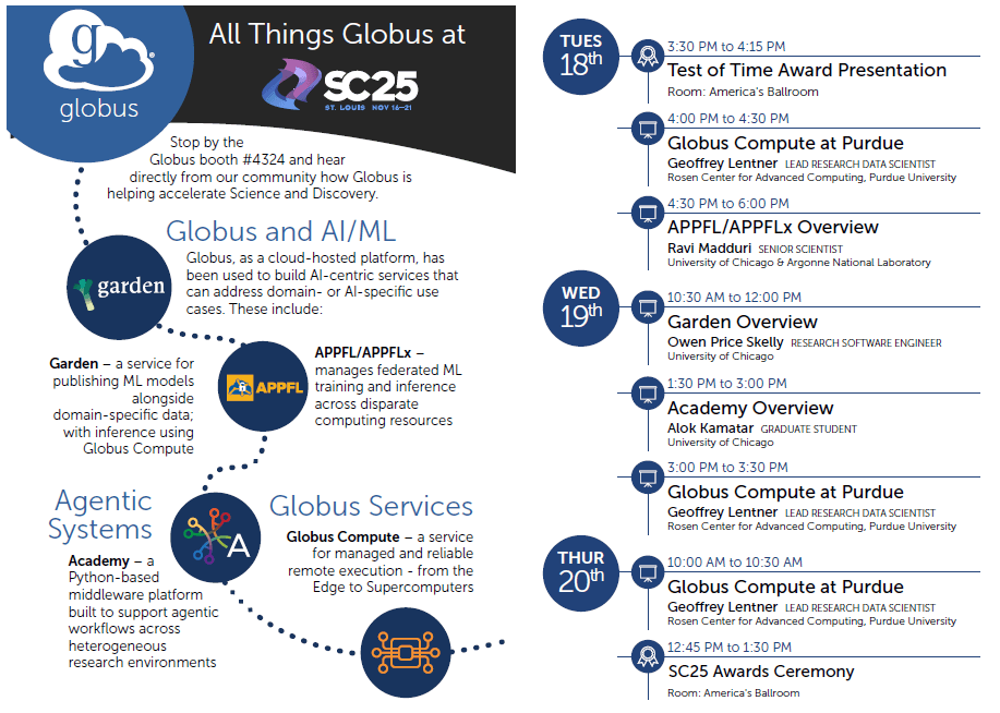 Globus will once again be exhibiting at this year’s conference. This year we will be hosting a number of community members to talk about Globus. Visit the Globus booth #4324 to learn more about our service and how Globus is being used to build AI-centric services.